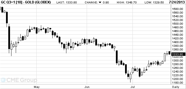 За последние четыре сессии золото подорожало почти на 6 процентов, что стало лучшим результатом с октября 2011 года, благодаря снижению опасений, что ФРС в ближайшее время начнет сокращать стимулы. ФРС заявила, что прекратит стимулировать экономику только тогда, когда убедится в ее устойчивости.