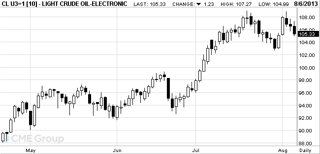 Цена сентябрьских фьючерсов на североморскую нефтяную смесь марки Brent снизилась на 94 цента, или на 0,9 процента, до $ 107,76 за баррель на лондонской бирже ICE Futures Europe.