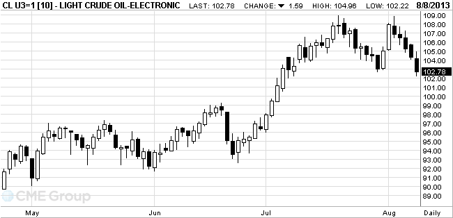 Стоимость сентябрьских фьючерсов на американскую легкую нефть марки WTI (Light Sweet Crude Oil) упала до 102,22 доллара за баррель на Нью-Йоркской товарной бирже.