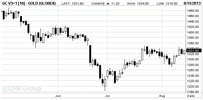 Цены на золото резко выросли, восстановив при этом большую часть потерь, понесенных вчера. Отметим, что на динамику торгов повлияла публикация американских данных, а также вчерашнее заявление главы ФРС Атланты Локхарта, который отметил, что Федеральная Резервная система может начать сокращать объемы покупок облигаций уже в сентябре, несмотря на то, что инфляция остается ниже целевого показателя правительства. Кроме того, он добавил, что американские экономические показатели остаются слишком смешанными для того, чтобы члены Федеральной Резервной системы уменьшили программу покупки активов в следующем месяце, и, в конечном счете, остановили ее. Стоит отметить, что уровень инфляции в США остается значительно ниже 2-процентной цели, установленной Федеральной резервной системой. Но Локхарт сказал, что не видит признаков разрастания дефляции. Он отметил, что текущий инфляционный фон вполне совместимым с небольшим снижением объемов покупок. Между тем, Локхарт заявил, что видит существенный прогресс на рынке труда, но отметил, что слабый экономический рост привел к образованию паузы.