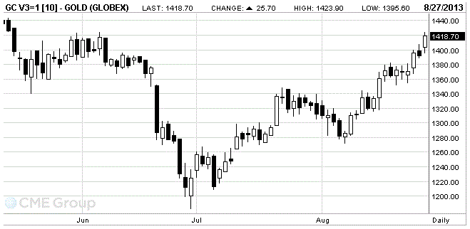 Цены на золото резко выросли сегодня, достигнув при этом самого высокого уровня с июня, так как политическая напряженность вокруг Сирии способствует повышению спроса на драгоценный металл как средство сбережения. Добавим также, что данная обеспокоенность также отразилась и на стоимости платины, цена которой достигла четырехмесячного максимума.
