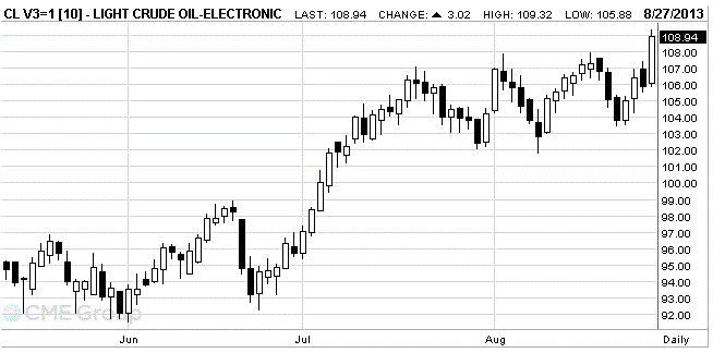 Цены подскочили на целых 3%, что было связано с заявлением министра иностранных дел Сирии Валида аль-Муаллема. В ходе пресс-конференцию он подтвердил, что у Сирии имеются все доказательства того, что именно бандформирования применили химическое оружие в пригороде Дамаска Восточной Гуте. Как отметил он, кто обвиняет в этом ВС Сирии, должен представить общественности свои аргументы. Аль-Муаллем также сообщил, что между ним и госсекретарем США Джоном Керри 22 августа состоялся телефонный разговор, в ходе которого глава МИД Сирии подтвердил заинтересованность страны в раскрытии правды о том, что действительно произошло в районе Гута 21 августа.