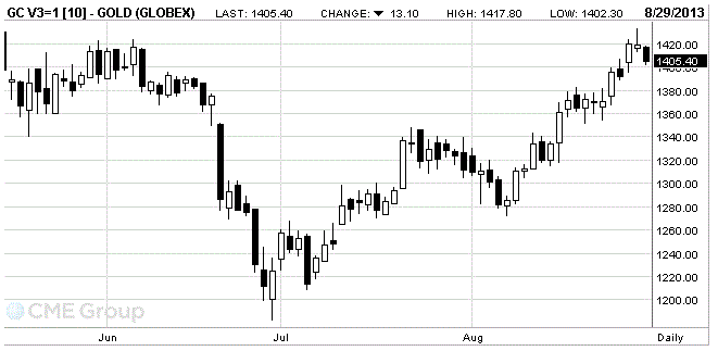 Стоимость фьючерсов на золото немного снизилась, что было связано с давлением со стороны доллара США, а также предположением инвесторов, что Федеральная резервная система вскоре может прибегнуть к снижению объема программы по покупке активов на фоне публикации лучших, чем ожидалось данных по ВВП.