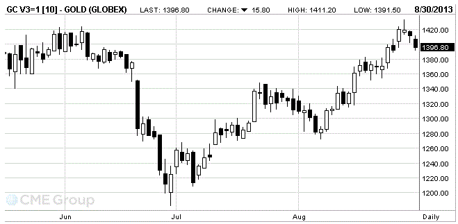 Стоимость октябрьского фьючерса на золото на COMEX сегодня снизилась до $1396.80 за унцию.