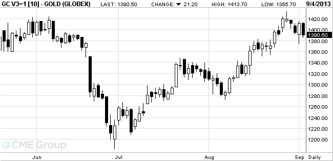 Цены на золото накануне восстановили позиции выше отметки 1400 долларов, когда высшие законодатели США выразили поддержку президенту Бараку Обаме, призывающему к военному удару против Сирии. Спикер палаты представителей Джон Бонер заявил, что лишь США имеют возможность остановить сирийского президента Башара Асада и предупредить использование химического оружия другими странами.