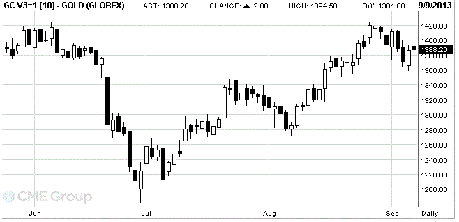 Стоимость октябрьского фьючерса на золото на COMEX сегодня выросла до $1388.20 за унцию.