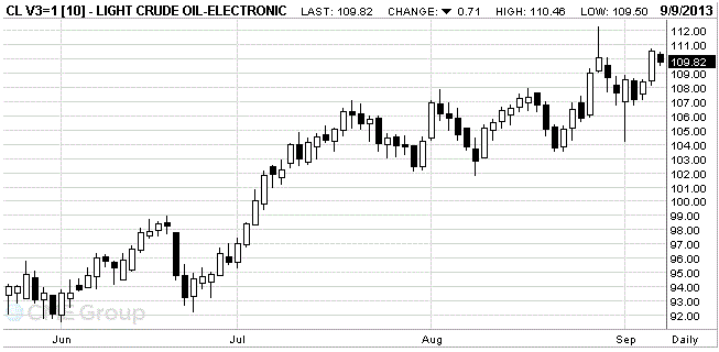 Стоимость нефтяных фьючерсов заметно снизилась сегодня, отступив при этом от двухлетнего максимума, на фоне того, что президент США Барак Обама изо всех сил пытался убедить Конгресс в необходимости нанесения военного удара по Сирии. Отрицательная динамика нефтяных котировок также обусловлена фиксацией прибыли, образовавшейся за предыдущие две сессии.