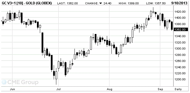Цены на золото существенно снизились сегодня, потеряв при этом около 2 процентов, после того, как Сирия приняла предложение России отказаться от химического оружия, чтобы предотвратить удар со стороны США.