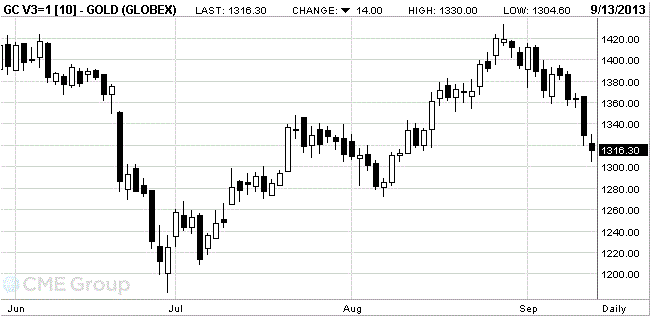 Цены на золото заметно снизились сегодня, достигнув при этом пятинедельного минимума, и направившись до наибольшего еженедельного снижения ха последние два месяца на перспективах, что США снизит объем стимулирующих мер в ближайшее время. Также на ход торгов оказывает влияние снижение опасения в отношении проведения военной операции против Сирии. Тем не менее, позже стоимость золота немного выросла, отступив от минимальных значений, но, не смотря на это, все еще торгуется с понижением.