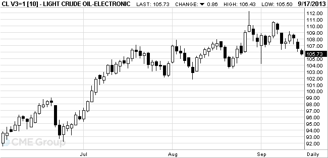 Стоимость нефти марки West Texas Intermediate дешевеет третий день после того, как США достигли соглашения с Россией по устранению химического оружия Сирии, и на спекуляциях, что Федеральная резервная система начнет сокращение стимулирующих мер.