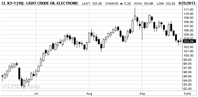 Стоимость ноябрьских фьючерсов на американскую легкую нефть марки WTI (Light Sweet Crude Oil) выросла до $103,39 за баррель на Нью-Йоркской товарной бирже.
