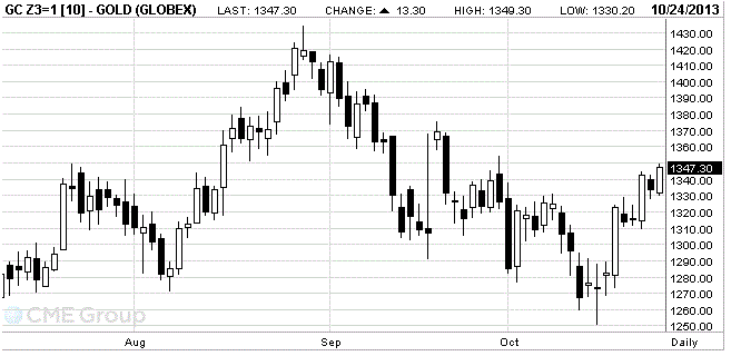 Стоимость декабрьского фьючерса на золото на COMEX сегодня выросла до $1347.30 за унцию.