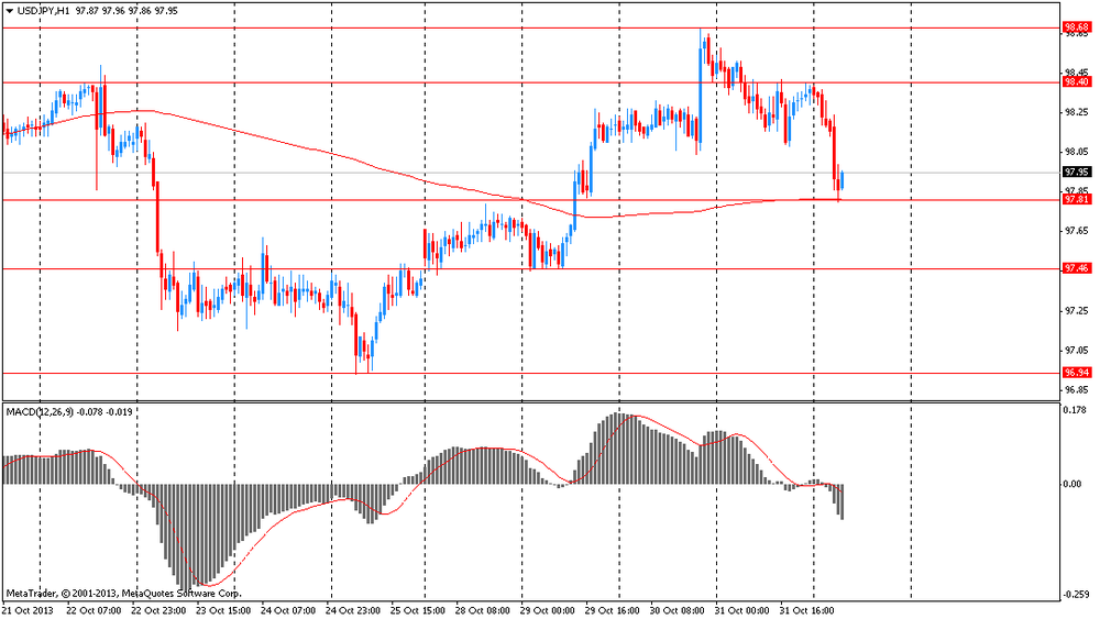 Евро упал к двухнедельному минимуму против доллара и иены на фоне экономической слабости евро-региона, что подпитывает слухи о возможном снижение процентных ставок Европейским центральным банком. В понедельник на динамику единой валюты будет влиять публикация данных по производственным заказам во Франции. Ожидается, что индекс деловой активности в производственном секторе, основанный на опросе менеджеров по снабжению французского производства, упадет в октябре до 49,4. Это может оказаться самым низким показателем с июня. Вчерашние отчеты также показали негативную динамику. С одной стороны уровень инфляции упал в прошлом месяце до 0,7% (минимум с ноября 2009 года), с другой уровень безработицы в сентябре составил рекордные 12,2%.