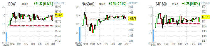 Сегодня в США отмечался День ветеранов, тем не менее фондовые рынки работали в обычном режиме, был закрыт только долговой рынок. В связи с этим, а также с отсутствием публикаций важных макроэкономических данных и значимых сообщений корпоративного характера, которые могли бы задать направление торгам, сессия прошла спокойно. Основные фондовые индексы проявили себя нейтрально. Сразу после открытия была заметна небольшая волатильность, но к середине торгов индексы стабилизировались, и не проявили никакой активности. Возможно, на фоне ралли предыдущего месяца, рынку просто нужно отдохнуть. Впрочем, возможен вариант приостановки роста рынка по причине неопределённости с программой количественного смягчения (QE). В любом случае, катализатор для движения рынка отсутствовал.