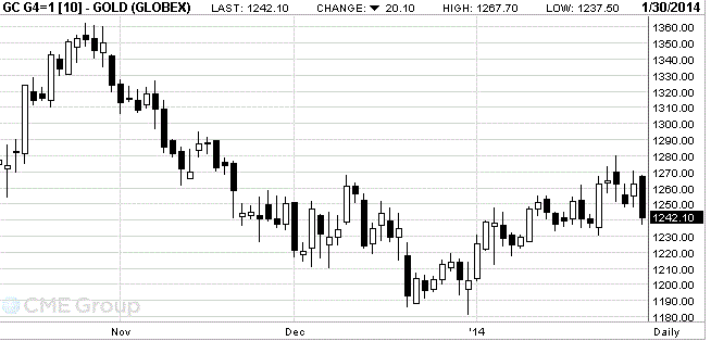 Цены на золото упали примерно на 1 процент, что было связано с заметным укреплением курса американской валюты, после того, как Федеральная резервная система США снова снизила объем своего денежно-кредитного стимулирования. Падение стоимости также было связано с тем, что многие инвесторы начали фиксировать прибыль предыдущей сессии. Напомним, что вчера Комитет по операциям на открытом рынке ФРС заявил, что сократит покупки облигаций до 65 млрд. долларов в феврале с 75 млрд. долларов в январе. ФРС также сообщила, что продолжит сокращение программы покупок облигаций в следующем месяце, подтвердив свою стратегию сворачивания этой программы малыми шагами в ходе каждого из заседаний, пока ситуация в экономике продолжает улучшаться. Добавим, что руководители ФРС дали неоднозначную оценку показателям экономики. С одной стороны, ФРС заявила, что данные, опубликованные с момента декабрьского заседания, "указывают на то, что рост экономической активности ускорился в последние кварталы". Однако представители ФРС назвали индикаторы рынка труда "неоднозначными", подразумевая, вероятно, разочаровывающий декабрьский отчет по занятости. Они также отметили, что восстановление на рынке труда "несколько замедлилось".