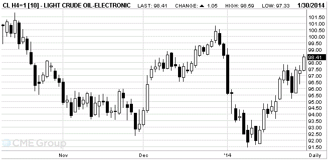 Что касается действий со стороны ФРС, то некоторые инвесторы полагали, что центральный банк США может удержаться от изменения своей программы, учитывая потрясения на развивающихся рынках. Снижение стимулирования позволило укрепить курс доллара, что повлияло на товары в долларовом выражении, такие как нефть.