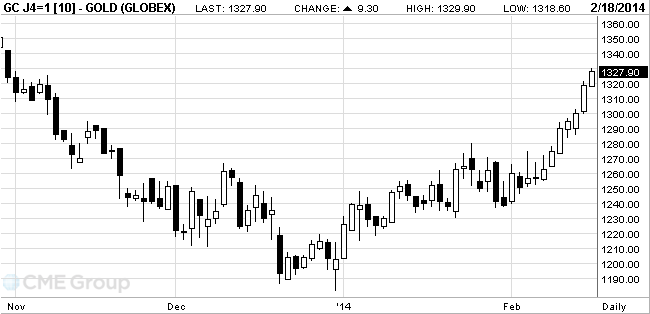 Стоимость апрельского фьючерса на золото на COMEX сегодня выросла до $1329.90 за унцию за унцию.