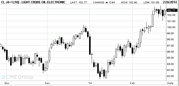 Стоимость апрельских фьючерсов на американскую легкую нефть марки WTI (Light Sweet Crude Oil) выросла до $102,77 за баррель на Нью-йоркской товарной бирже (NYMEX).