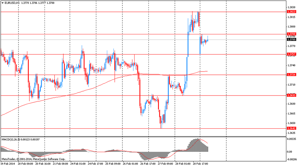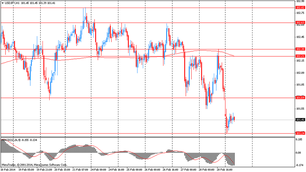 Иена выросла против всех основных валют в результате повышенного спроса на валюты-убежища после ввода российских вооруженных сил на территорию Украины. Стало известно, что завтра госсекретарь США Джон Керри поедет в Киев, встретится с украинскими лидерами и, вероятно, предложит поддержку. Напряжение в регионе достигло своего пика со времен “холодной войны”. Помимо этого, Белый дом заявил о прекращении странами G7 (Канада, Франция, Германия, Италия, Япония, Великобритания и США) подготовки к саммиту «восьмерки» в Сочи. Страны G7 заявили, что поддерживают суверенитет и территориальную целостность Украины и намерены поддерживать страну в контактах с МВФ, чтобы составить новую программу кредитования.