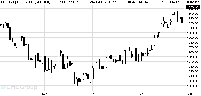 Цены на золото выросли более чем на 1 процент из-за обострения ситуации в Крыму.