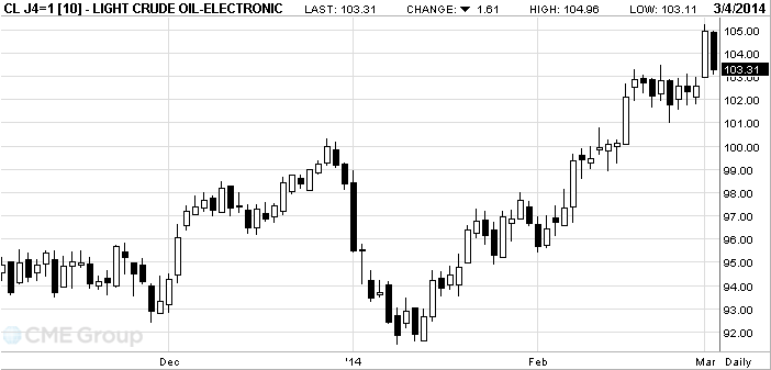 Стоимость апрельских фьючерсов на американскую легкую нефть марки WTI (Light Sweet Crude Oil) упала до $103,11 за баррель на Нью-йоркской товарной бирже (NYMEX).