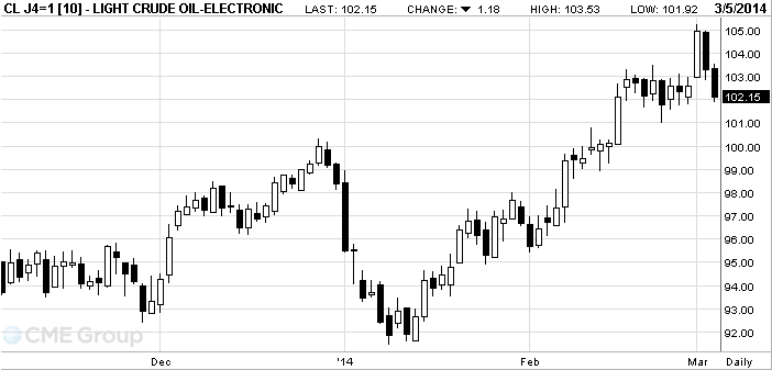 Фьючерсы упали на 1,1 процента на торгах в Нью-Йорке после того, как Управление энергетической информации сообщило об увеличении запасов на 1,43 млн. баррелей на прошлой неделе. Цены также снизились на спекуляциях относительно того, что споры в Крымском регионе Украины не будут нарушать поставки нефти.