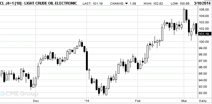 Стоимость апрельских фьючерсов на американскую легкую нефть марки WTI (Light Sweet Crude Oil) снизилась до $101,19 за баррель на Нью-йоркской товарной бирже (NYMEX).