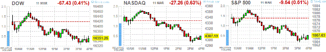 Основные фондовые индексы США зафиксировали по итогам сессии отрицательную динамику. После открытия регулярной сессии были опубликованы данные по оптовым запасам в США за январь, которые выросли больше ожиданий. Об этом говорится в докладе, распространенном сегодня Министерством торговли. В то же время в докладе показано и резкое падение оптовых продаж. Согласно отчету, оптовые запасы поднялись на 0.6% в январе после пересмотренного с повышением увеличения на 0.4% в декабре. Экономисты ожидали увеличения запасов на 0.5% по сравнению с 0.3% ростом, о котором первоначально сообщалось.