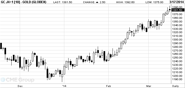 Цены на золото обновили полугодовой максимум и отступили в ходе волатильных торгов. На рынках продолжает расти спрос на надежные активы, коим является золото, в свете продолжающегося конфликта в Крыму. В то же время рынки неоднозначно реагируют на смешанную статистику США.