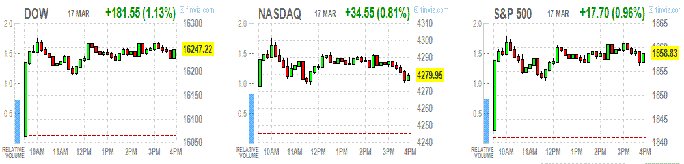 До публикации утренних новостей фьючерсы на основные индексы находились в плюсовой зоне. Вызвано это было тем, что референдум в Крыму прошёл спокойно, а весь негатив данного события уже был заложен в динамике прошлой недели. Другими словами, инвесторы выдохнули, потому что в выходные обошлось без насилия. Публикация промышленного производства также внесла свою лепту в динамику торгов. После открытия основные индексы приумножили положительную динамику индексов.