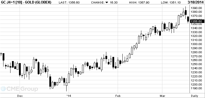 Стоимость золота снижается вторую сессию подряд на фоне укрепления доллара из-за политической нестабильности в Крыму и реакции Запада.