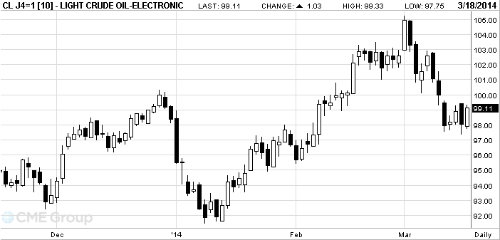 Стоимость апрельских фьючерсов на американскую легкую нефть марки WTI (Light Sweet Crude Oil) выросла до $99,33 за баррель на Нью-йоркской товарной бирже (NYMEX).