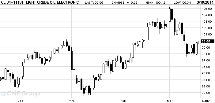 Стоимость апрельских фьючерсов на американскую легкую нефть марки WTI (Light Sweet Crude Oil) выросла до $100,42 за баррель на Нью-йоркской товарной бирже (NYMEX).