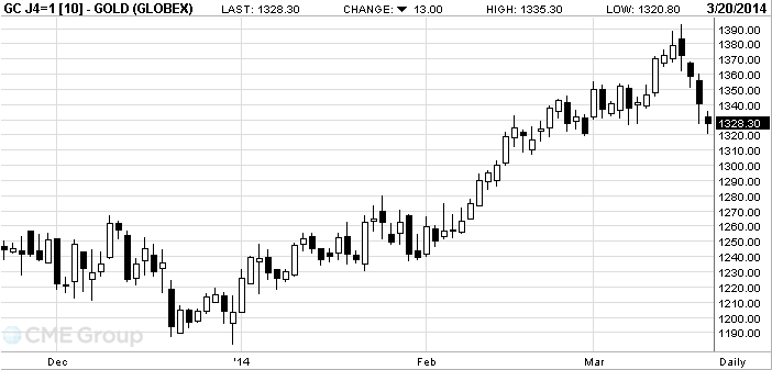 Стоимость апрельского фьючерса на золото на COMEX сегодня упала до $1320.80 за унцию.