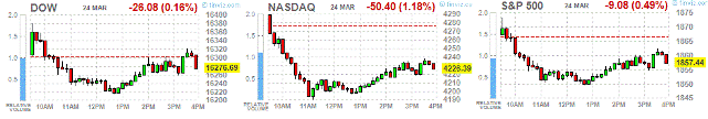 Американские фондовые индексы показали по итогам сессии отрицательную динамику, но смогли отступить от минимумов. Давление на индексы оказали данные по США. Согласно первоначальной оценке, индексу деловой активности в промышленности (PMI), вычисляемому аналитической компанией Markit, снизился в марте до 55,5 пункта с 57,1 пункта в феврале, что отражает замедление темпов роста деловой активности в промышленности США. Показатель числа новых заказов опустился до 58 пунктов с 59,6 пункта, занятости в секторе — до 53,9 пункта с 54,1 пункта. Аналитики ожидали снижения индекса до 56,5 пункта.