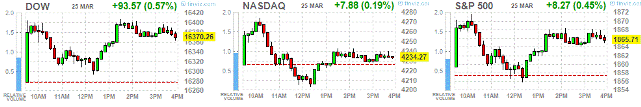 Основные фондовые индексы США демонстрировали в ходе сессии разнонаправленную динамику, но смогли закрыться с небольшим повышением. Сегодняшний день сопровождался большим количеством макроэкономических новостей в США и за её приделами. Так, после открытия рынка был опубликован индекс производственной активности от ФРБ Ричмонда, который неожиданно упал в марте. Как показал отчет Федерального резервного банка Ричмонда, в марте производственные условия в регионе существенно ухудшились по сравнению с предыдущим месяцем. Соответствующий индекс производственной активности снизился до -7 пунктов в марте против -6 в феврале. Экономисты ожидали, что индекс вырастет до -1 пункта.