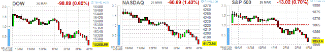 Основные фондовые индексы США закрылись ниже нулевой отметки, вблизи минимумов сессии. На динамику повлияли представленные данные по США, а также комментарии представителя ФРС Булларда. Министерство торговли заявило сегодня: заказы на самолеты взлетели в феврале, маскируя медленный спрос на другие промышленные товары длительного пользования. Согласно отчету, заказы на товары длительного пользования - такие продукты, как холодильники и авто, срок использования которых более трех лет - выросли с учетом сезонных колебаний на 2,2% в феврале по сравнению с месяцем ранее. Это самое сильное значение с ноября. Результат января был пересмотрен в сторону понижения до падения на 1,3%. Экономисты прогнозировали, что в целом заказы на товары длительного пользования увеличатся на 1,1%. Новые заказы на гражданские и оборонные самолеты и запчасти возглавили рост. Без учета волатильного транспортного сегмента, заказы на товары длительного пользования выросли лишь на 0,2%. Новые заказы на первичные металлы и электронные изделия возглавили рост. Но спрос на электрические машины и оборудование сократился в прошлом месяце.