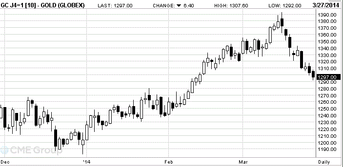 Цены на золото продолжили снижаться сегодня, достигнув при этом шестинедельного минимума, что было связано с давлением со стороны укрепления доллара и признаков улучшения экономики США. Сегодняшний отчет от Министерства торговли США показал: потребительские расходы в конце прошлого года повысились более значительно, чем предполагалось ранее, что оказало поддержку экономике перед недавними сбоями, вызванными суровыми погодными условиями этой зимой. Согласно представленным данным, валовой внутренний продукт (самый широкий индикатор товаров и услуг, произведенных в экономике) в 4-м квартале 2013 года вырос на 2,6% по сравнению с тем же периодом предыдущего года. Это значение выше второй оценки, согласно которой ВВП вырос на 2,4%, однако ниже прогноза экономистов относительно роста на 2,7%. Рост ВВП в 4-м квартале замедлился после роста на 4,1% в 3-м квартале, однако индикатор базовой силы экономики повысился. Рост реальных конечных продаж, не учитывающих подверженные волатильности запасы, ускорился до 2,7% с 2,5% в 3-м квартале. Последний отчет по ВВП свидетельствовал о том, что потребительские расходы, отвечающие примерно за две трети от общего ВВП, росли самыми быстрыми темпами с конца 2010 года. В 4-м квартале потребительские расходы повысились на 3,3%, тогда как ранее предполагался их рост на 2,6%. В 3-м квартале они повысились на 2%.