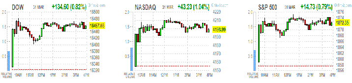 Основные фондовые индексы США провели все торги на положительной территории. Катализатором роста и восстановления после падения прошлой недели стало выступление председателя Федеральной резервной системы Джанет Йеллен и снижение напряжённости вокруг событий в Украине.