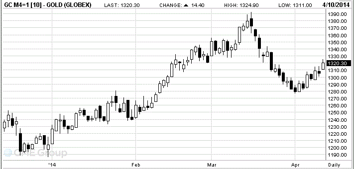 Цены на золото заметно выросли сегодня, достигнув при этом двухнедельного максимума, поскольку участники рынка продолжали анализировать опубликованные вчера протоколы последнего заседания FOMC. Инвесторы опасались, что при признаках восстановления рынка труда регулятор может повысить процентные ставки уже в ближайшее время. На пресс-конференции после предыдущего заседания глава регулятора Джанет Йеллен заявила: ставка может быть повышена уже через 6 месяцев после того, как выкуп активов будет полностью свернут, - то есть в середине 2015 года, если нынешние темпы сокращения программы сохранятся. Как показали протоколы, в ходе обсуждения Комитет решил, что при условии развития экономики в рамках прогнозов регулятора на предстоящих заседаниях могут быть приняты очередные решения о сокращении QEIII. При этом члены комитета подчеркивают: предопределенного объема уменьшения программы нет, все будет зависеть от текущей ситуации с безработицей и инфляцией.