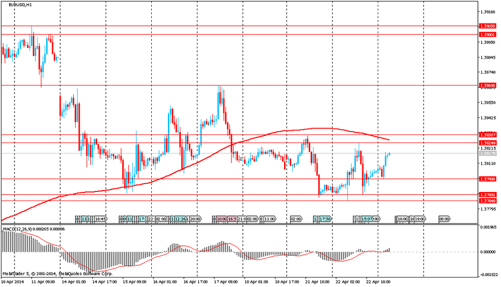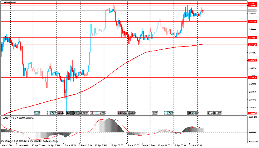 Доллар торговался около двух-недельного максимума против иены в преддверии сегодняшней публикации отчета по производству и объему продаж новых домов в США. Согласно среднему прогнозу экономистов, Министерство торговли США отчитается о росте продаж новых домов в марте на 2,3% к 450 тыс. в годовом исчислении с предыдущим месяцем, когда они упали на 3,3%. Ожидается, что предварительные данные по индексу деловой активности в производственном секторе США также вырастут в апреле до 56.2, против 55.5 в марте.