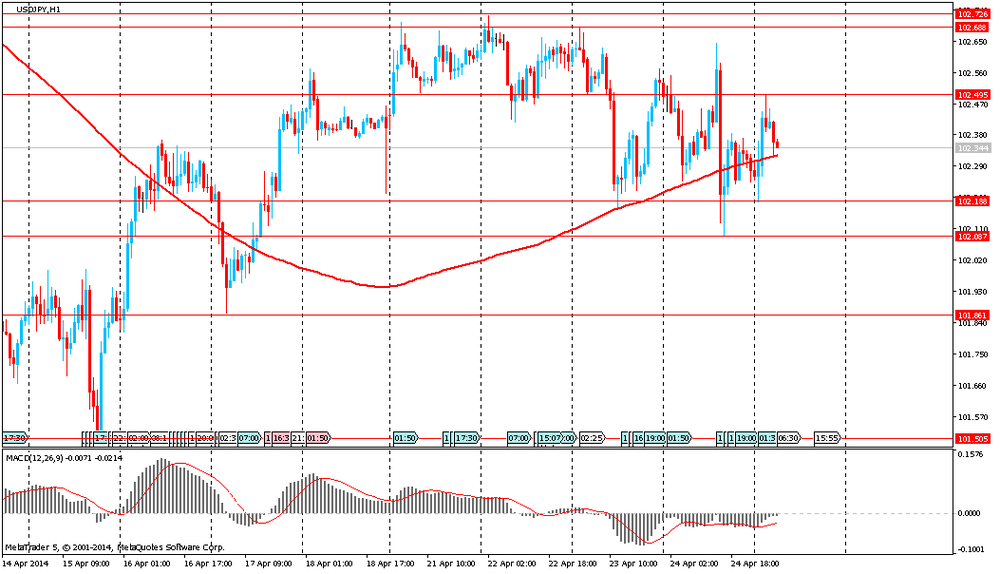 Иена торгуется вблизи недельного максимума против доллара США на фоне роста напряженности между Россией и Украиной, что провоцирует спрос на валюту-убежище. Вчера японская валюта существенно укрепилась после того, как государственный секретарь США Джон Керри заявил, что Россия не выполняет Женевских соглашений, направленных на де-эскалацию ситуации в Украине.