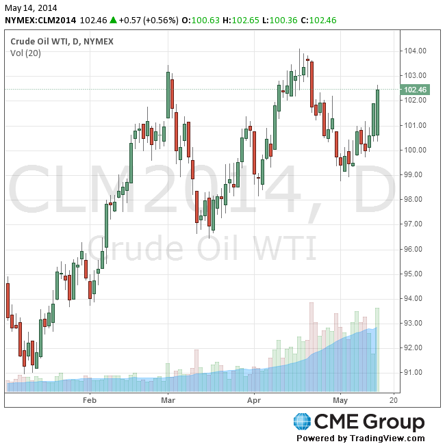 Стоимость июньских фьючерсов на американскую легкую нефть марки WTI (Light Sweet Crude Oil) выросла до $102,65 за баррель на Нью-йоркской товарной бирже (NYMEX).