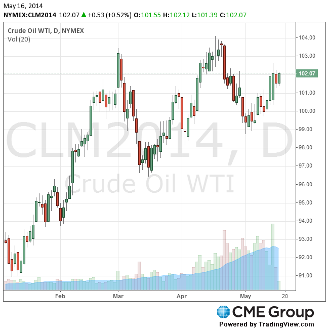 Стоимость июньских фьючерсов на американскую легкую нефть марки WTI (Light Sweet Crude Oil) выросла до $102,12 за баррель на Нью-йоркской товарной бирже (NYMEX).