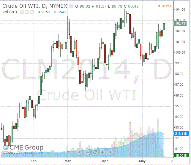Стоимость июньских фьючерсов на американскую легкую нефть марки WTI (Light Sweet Crude Oil) выросла до $102,73 за баррель на Нью-йоркской товарной бирже (NYMEX).