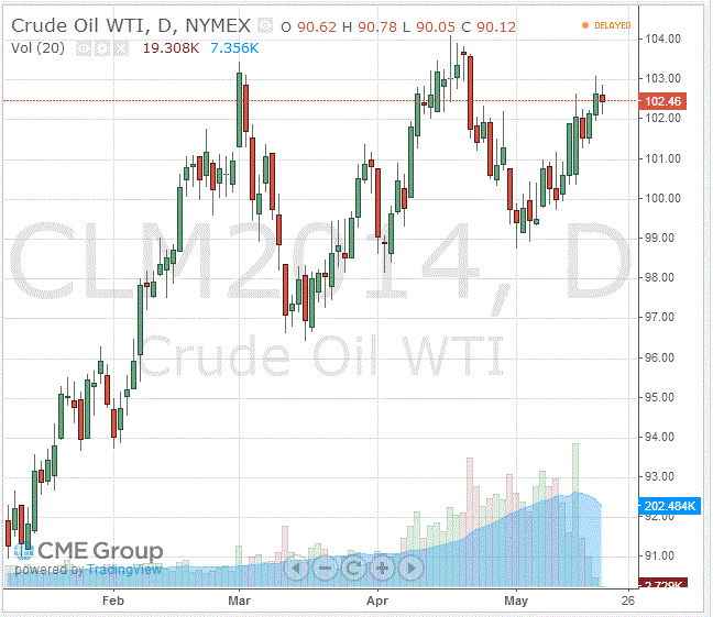 Стоимость июньских фьючерсов на американскую легкую нефть марки WTI (Light Sweet Crude Oil) упала до $102,46 за баррель на Нью-йоркской товарной бирже (NYMEX).