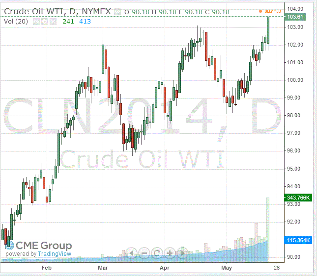 Стоимость июльских фьючерсов на американскую легкую нефть марки WTI (Light Sweet Crude Oil) выросла до $103,61 за баррель на Нью-йоркской товарной бирже (NYMEX).
