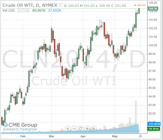 Стоимость июльских фьючерсов на американскую легкую нефть марки WTI (Light Sweet Crude Oil) выросла до $104,36 за баррель на Нью-йоркской товарной бирже (NYMEX).