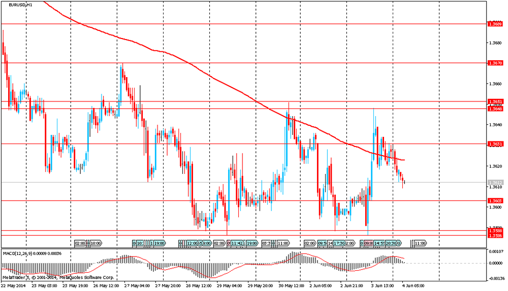 Спрос на евро остается ограниченным на ожиданиях, что Европейский центральный банк станет первым среди крупнейших ЦБ, который переведет процентную ставку в отрицательную зону. Заседание ЕЦБ состоится 5 июня. Отрицательная учетная ставка означает, что вкладчикам невыгодно держать свою наличность на счетах банка, так как на депозиты не только не начисляются проценты, а наоборот – списываются с них. Таким образом, ЕЦБ намерен увеличить кредитование бизнеса частными банками и снизить курс евро относительно доллара и иных твердых валют. Согласно опросу экономистов, 32 из 50 считают, что ЦБ сократит ставку по депозитам до минус 0,1%.