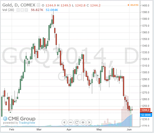 Стоимость июньского фьючерса на золото на COMEX сегодня упала до $1244.2 за унцию.